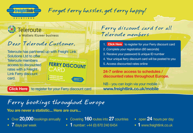Pasagerii autoturismelor și caravanelor nu pot călătorii folosind serviciile feriboturilor de marfă. Dacă călătoriți cu o furgonetă, vă rugăm să alegeți opțiunea "Furgonetă" din meniul disponibil pentru vehicule.